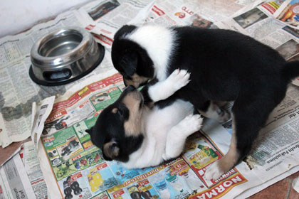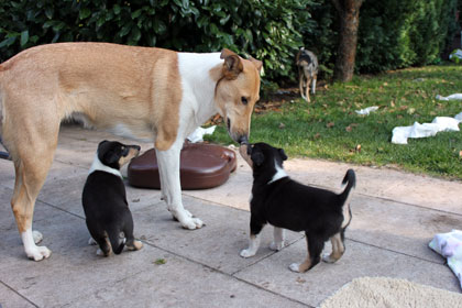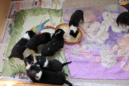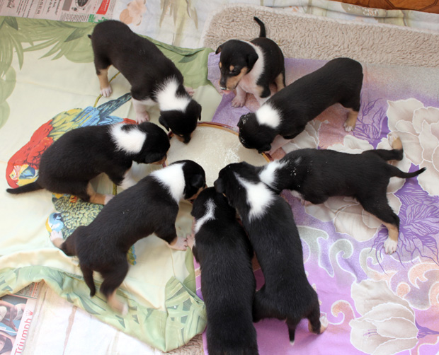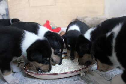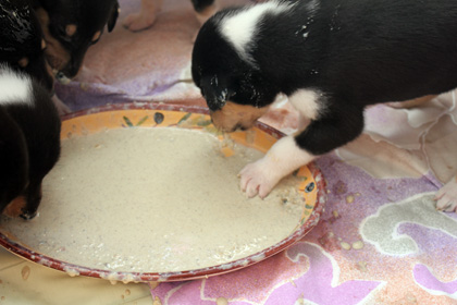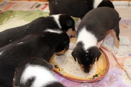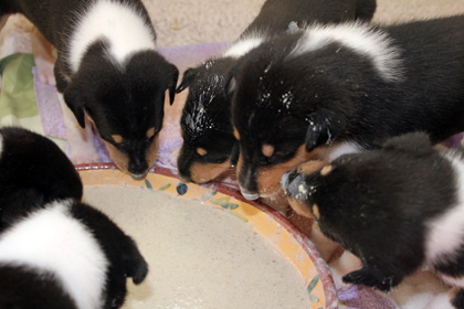 Mit 3 1/2 Wochen üben sich die Welpen am "gemeinsamen Fressen".