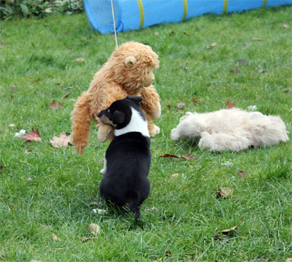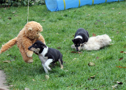 Besuch ist auch schon viel da gewesen. Sie lernen nun wie man mit Spielzeug und am besten mit seinen Geschwistern balgt. Geräusche CD wird als Unterhaltung gehört, wenn es fressen gibt ertönt eine Hundepfeife und der Schlachtruf "wutz, wutz". Kelsey ist die beste Hundemama die man sich vorstellen kann. Sie will immer noch ihre Welpen säugen und anschließend mit ihnen kuscheln.