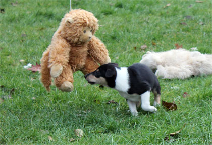 Alle Rudelmitglieder nehmen regen Anteil bei der Welpenaufzucht. Sogar unsere kleine Irina will schon helfen