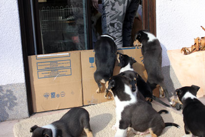 Am Anfang wenn wir zu füttern werden die Welpe einzeln mit Welpenmilch gefüttert. Danach dürfen sie gemeinsam fressen. Das natürlich in einer kleinen Schlammschlacht ausartet.