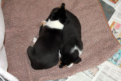 Platz ist im kleinsten Körbchen aber nur für 6 Welpen, die anderen lagen (Tajba und Ivanhoe) zusammen gekuschelt auf der Decke