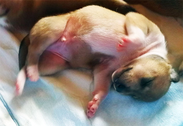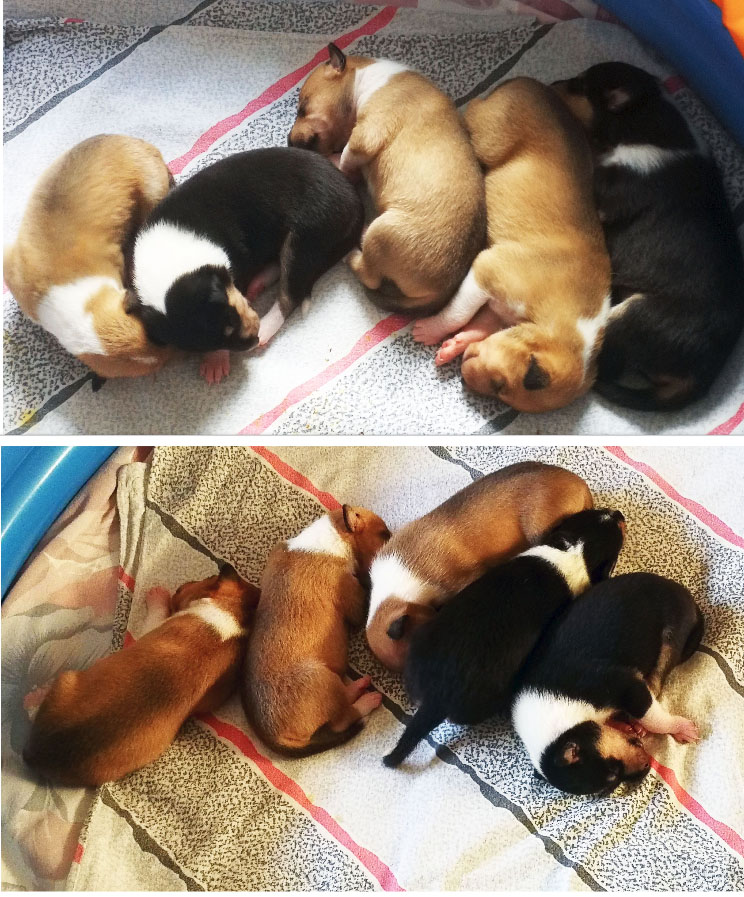 links Welpe 2 (Rüde) 1 Tag alt und rechts der gleiche Welpen mit 12 Tagen. Mehr auf unserem Welpenblog