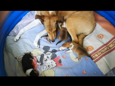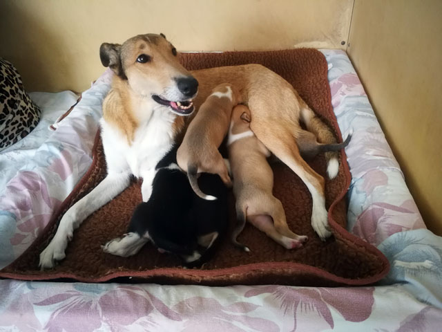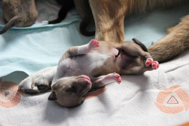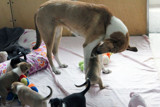 es kommt mehr Bewegung in die Welpen wenn Mama Sally zum Säugen kommt.