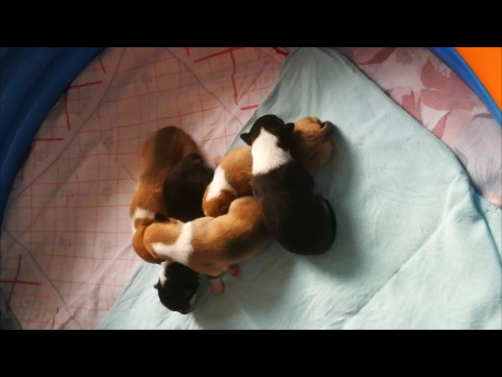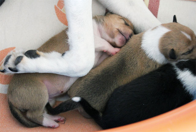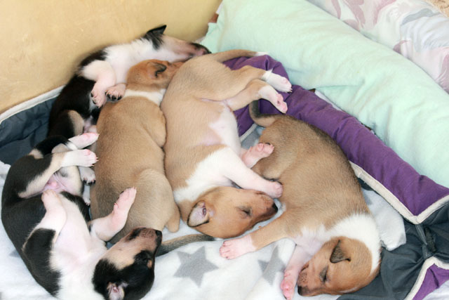 mit gut 14 Tagen ist viel los bei Sally´s Milchbar. Vor lauter kämpfen und trinken sind alle Welpen dann müde.