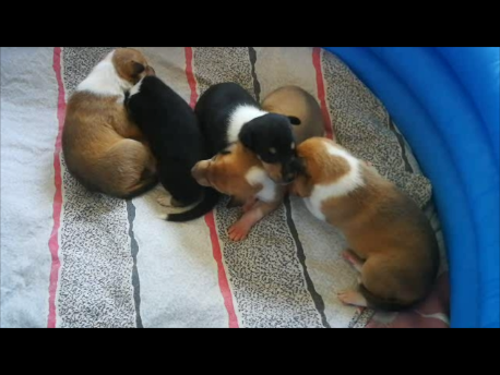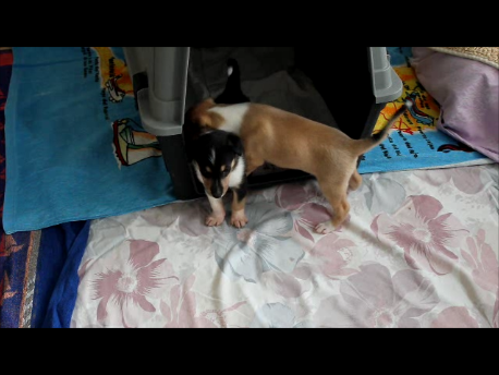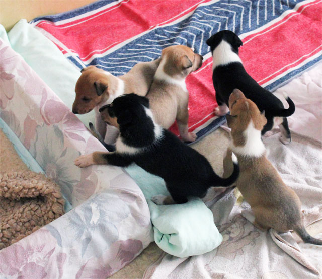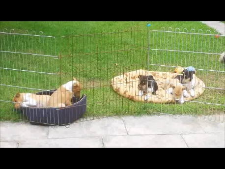 Der Erste hat es schon versucht auszubrechen. Nun wird es Zeit ins Wohnzimmer umzuziehen. Mit dem Handy werden die Bilder auch nicht mehr so gut, da die Welpen sich jetzt doch mehr bewegen und die Bilder dabei unscharf werden.