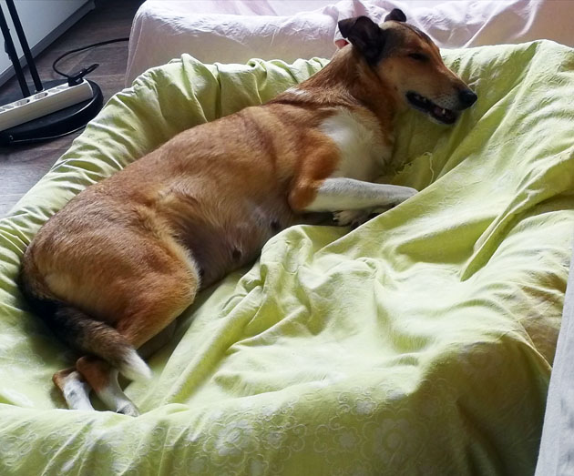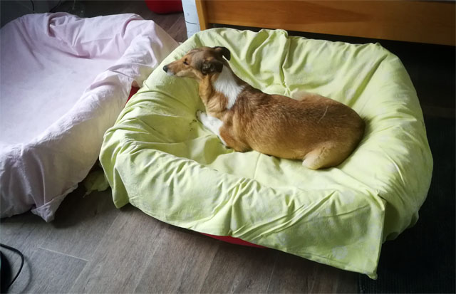 Am späten Nachmittag zeigte Sally mir das sie gerne ohne ihre Verwandtschaft und nur mit mir nach oben in ihr Körbchen wollte wo Sie schläft. Na dann haben es Sally und ich es uns gemütlich gemacht.