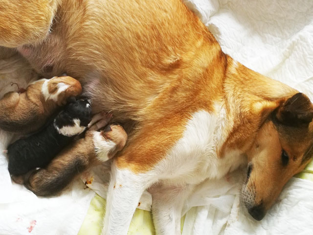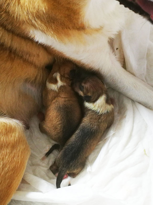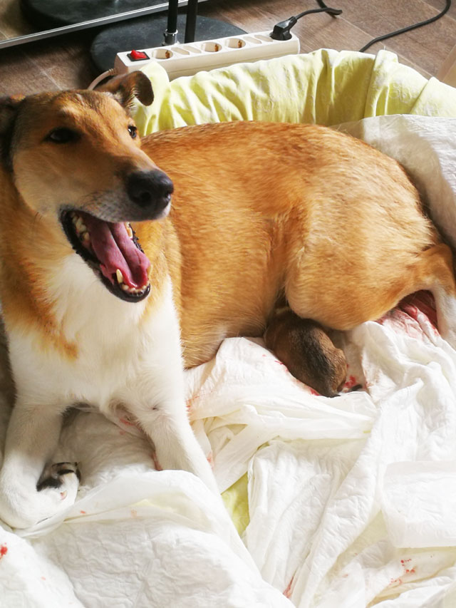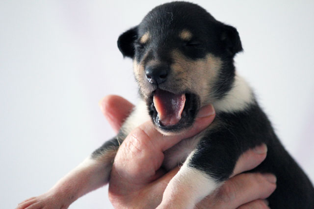 Der erste Welpe hat um 13:10 Uhr das Licht der Welt erblickt. Eine Hündin sable. Eine kräftige Hündin mit 338 Gramm. Sie hat den Weg für die anderen Welpen geebnet.