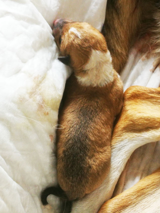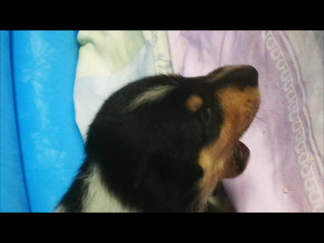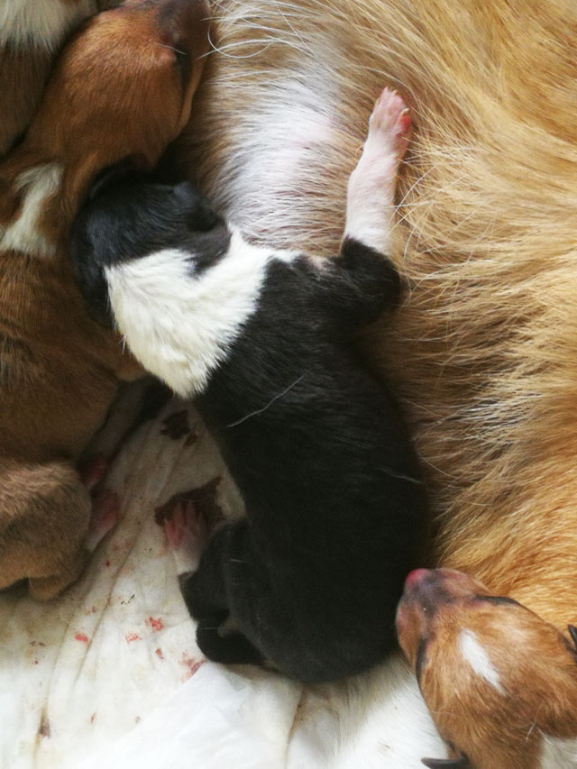 nach 23 Minuten um 14:35 Uhr wurde Welpe 3 geboren Hündin tricolour mit 285 Gramm