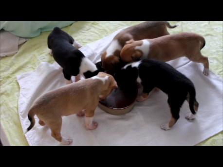 4 Wochen sind die Welpen nun alt. Die Zeit rast schon wieder. Ab der 4. Woche füttern wir zu um Sally etwas zu entlasten.