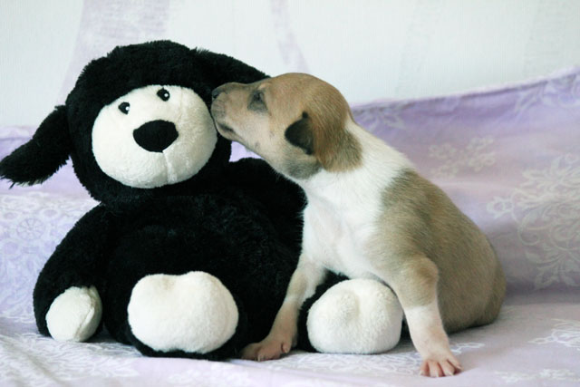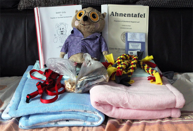 Zum Abschied gab es dann noch ein kleines Paket mit. Es waren Spielsachen, eine Kuscheldecke, für die Jungs blau und für die Mädels rosa. Leckerchen, die ich selber gebacken und getrocknet habe, natürlich auch was gekauftes. Ein Kuscheltier, Geschirr mit Leine und für die Barfer eine Mappe mit Barfplan und viel Infomaterial damit nichts schief geht beim Füttern.