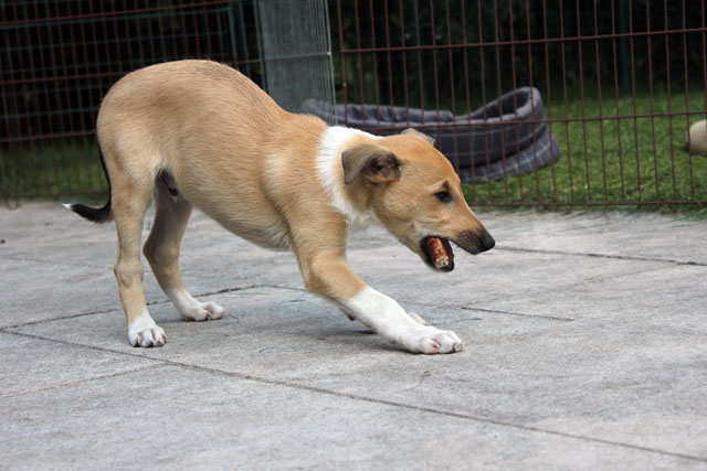 Mittlerweile sind die Welpen sobald es das Wetter zu lässt täglich in unserem Garten. Dort wird viel gespielt und getobt. Es gibt viele Spielsachen, ein Bällebad, eine "Hundehütte" in die sich die Welpen gerne aufhalten und vieles mehr zum Erleben.