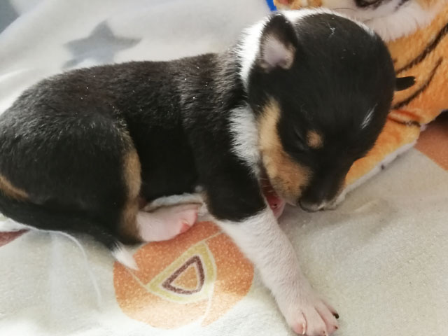 Am Sonntag Morgen haben wir mit dem Messen der Körpertemperatur angefangen. Wir fangen mit dem Messen am 58. Tag der Schwangerschaft an. Erst ein bis zwei mal am Tag, damit sich die Hündin daran gewöhnt. Dann öfters am Tag. Die normale Körpertemperatur beim Hund liegt etwa bei 38-39 Grad. Am Sonntag Mittag ging die Körpertemperatur auf 36,7 Grad herunter. Also ein sicheres Zeichen, daß die Geburt binnen 6-36 Stunden bevor steht. Am Dienstag wollte Merida ohne ihre Verwandtschaft sein und nur mit mir nach oben in ihr Körbchen gehen wo Sie schläft. Merida und ich haben es uns gemütlich gemacht. Nach einer langen durchwachten Nacht sind am Mittwoch Merida`s Welpen geboren. Merida hat uns 4 Welpen geboren. Der erste Welpe ist eine Hündin tricolour mit nur 123 g. Der zweite Welpe kam leider tot auf die Welt, es war auch eine tricolour Hündin. Dann kam eine sable Hündin, auch sehr leicht, mit nur 129 Gramm. Der letzte im Bunde ist ein tricolour Rüde mit 197 Gramm. Leider hat alles Kämpfen um die sable Hündin nichts geholfen. Wir mussten Sie am Montag ziehen lassen. Auch die tricolour Hündin haben wir verloren. Sie ist am Mittwoch über die Regenbogenbrücke gegangen. Wir sind sehr traurig. Ja, die Natur hat eben anders entschieden.