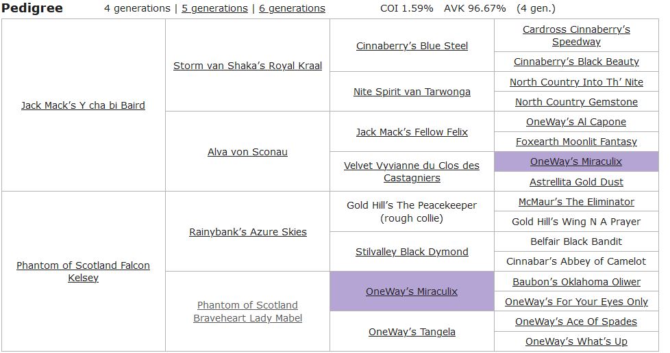 Inzucht-Koeffizient : 3.34% (5 Generationen) AKV: 95.16% (5 Generationen)