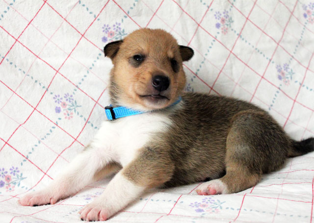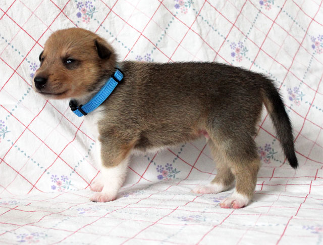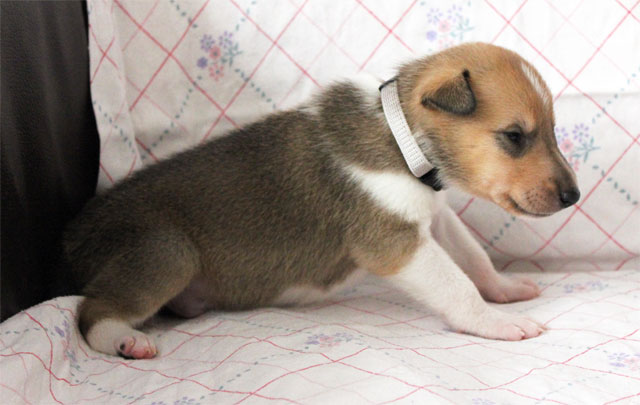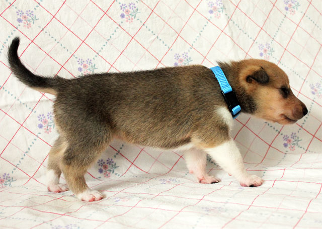 | Welpe 8 Rüde Phantom of Scotland Kings Cross Malcolm vergeben Halsband hellblau |