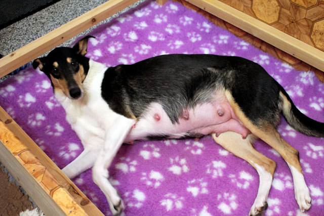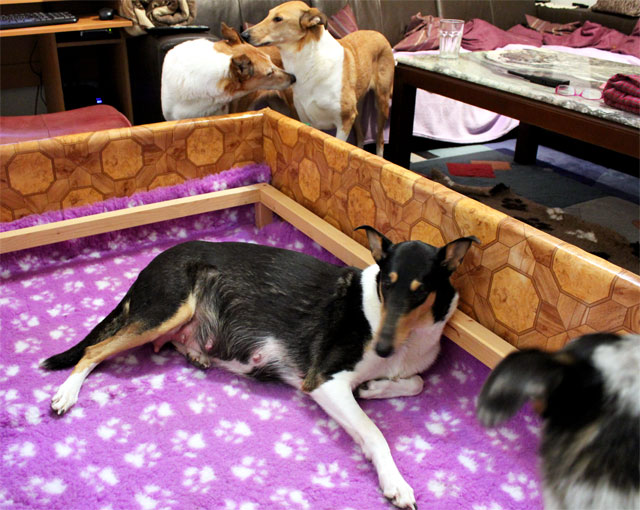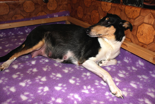 Kelsey ist wieder dicker geworden. Man spürt deutlich die Bewegungen der Welpen wie sie "strampeln". Es ist alles vorbereitet für die Geburt der Welpen. Die Spannung steigt.