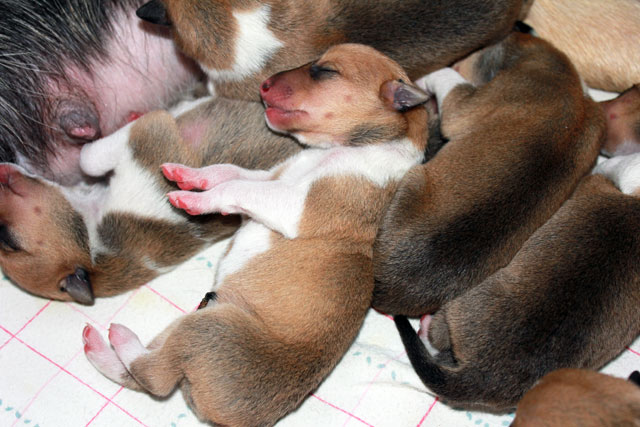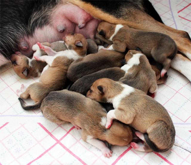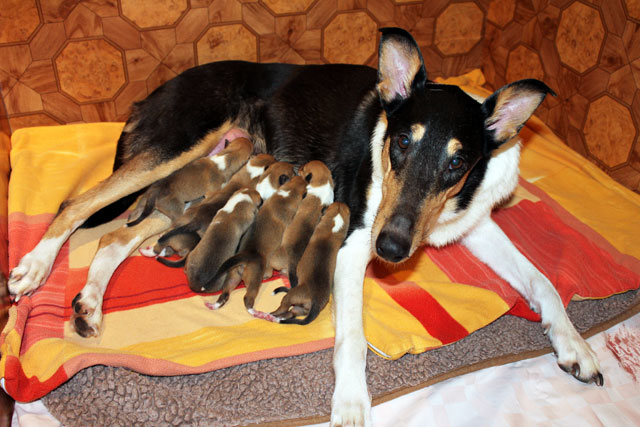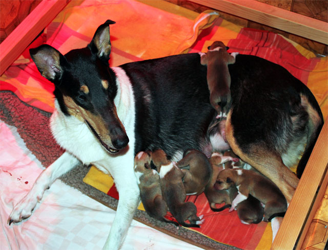 Kelsey mit ihren 8 Welpen kurz nach der Geburt