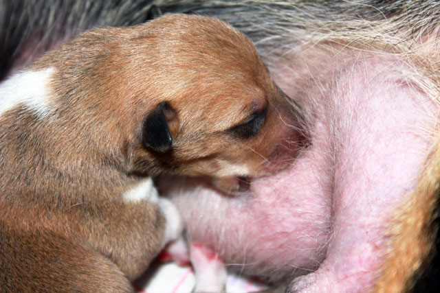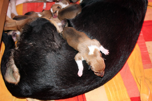 Unsere Hündin Kelsey hatte es wohl recht eilig mit dem gebären ihrer Welpen. Der erste Welpe kam um 16.33 Uhr auf die Welt und der letzte um 18.16 Uhr. Kelsey hat also 8 Welpen in 1 Stunde und 33 Minuten geboren. Die Welpen wiegen zwischen 260 und 330 Gramm. Alle Welpen trinken fleißig an Mamas Zitzen. Mutter und Welpen geht es gut.
