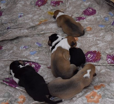 2 sable Rüden , 1 sable Hündin, 1 tricolour Rüden und 1 tricolour Hündin