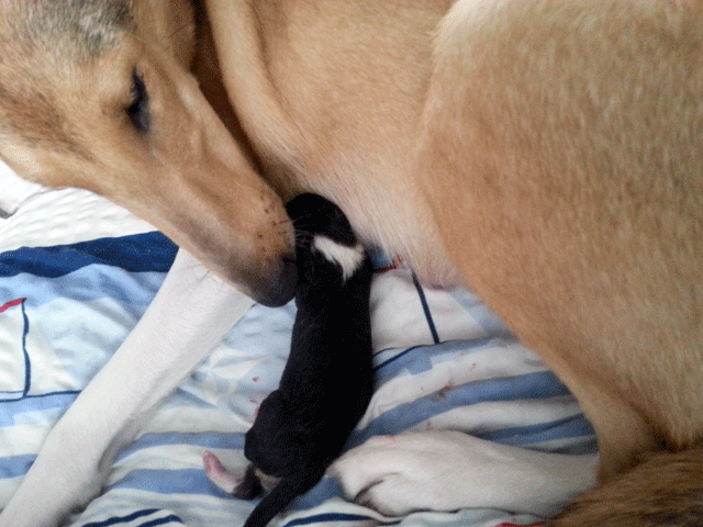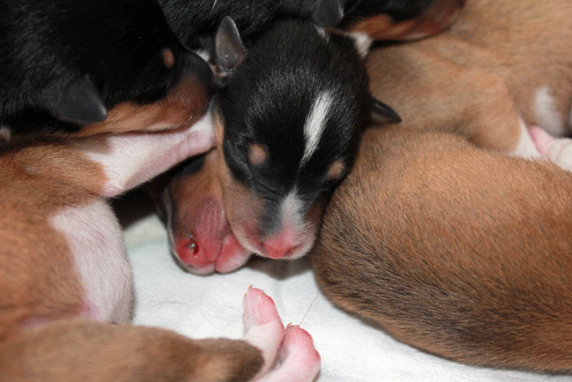 06.04.2015 4 Tag Welpe "rosa" kuschelt mit Mama
