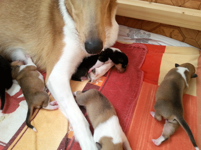 Merida hat die Geburt ihrer Welpen ganz super gemeistert. Sie hat es auch "gnädig" gemacht und die Geburt auf den Tag verlegt. In 2 Stunden 12 Minuten hat sie ihren 8 Kinderlein das Leben geschenkt.