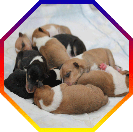 Es sind 3 Rüden zobel-weiß, 2 Hündinnen zobel-weiß und 3 Hündinnen tricolour.
