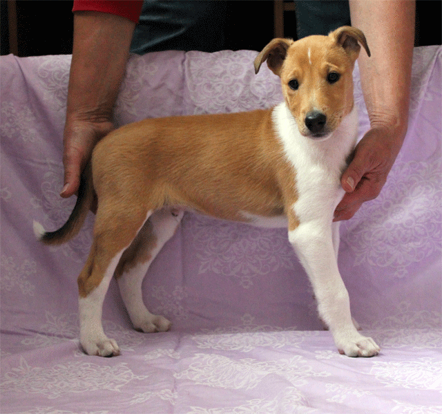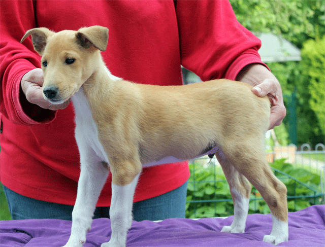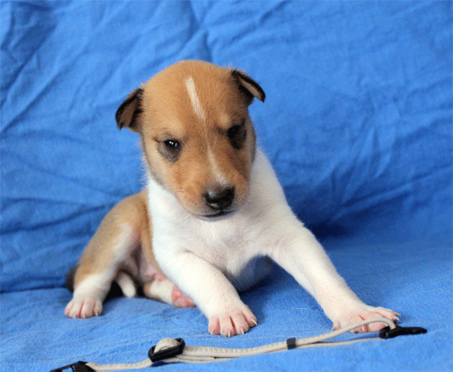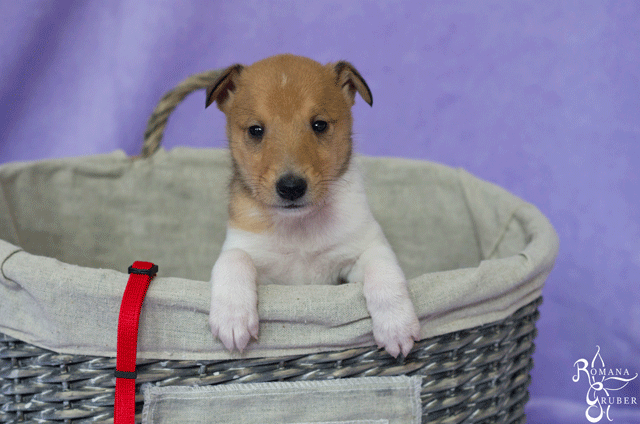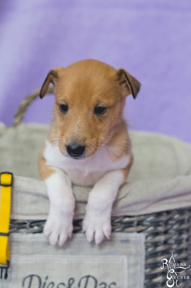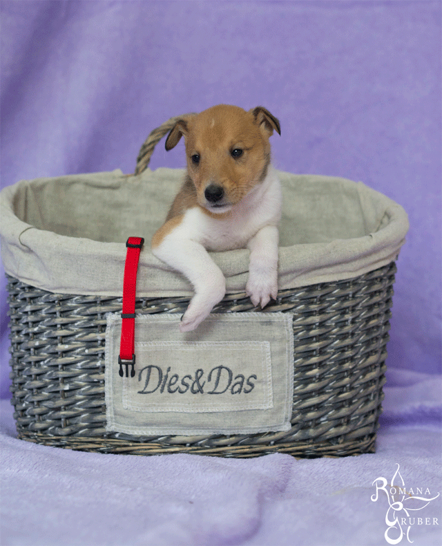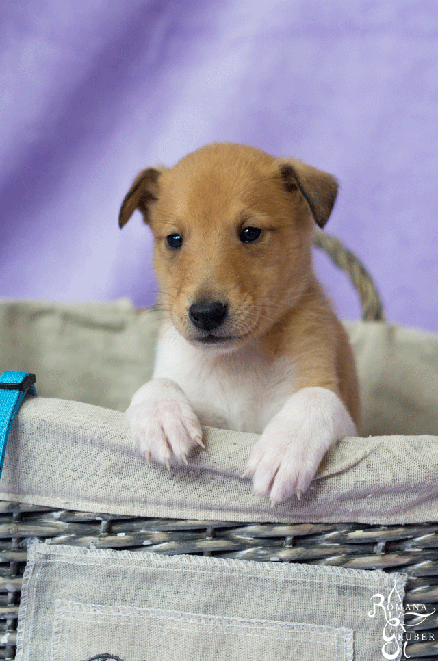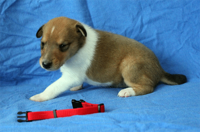 Welpe 8 Hündin sable geboren 16.54 Uhr, Halsband rot