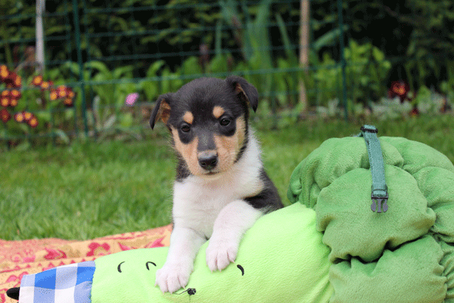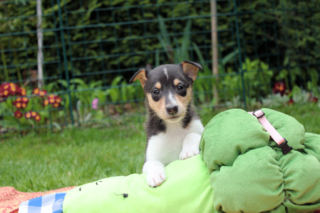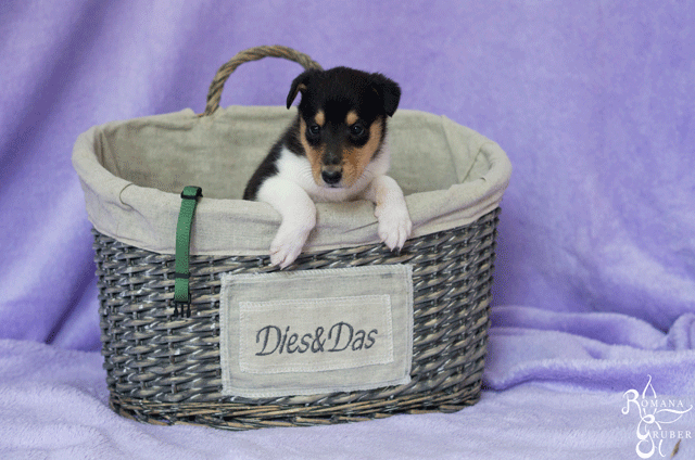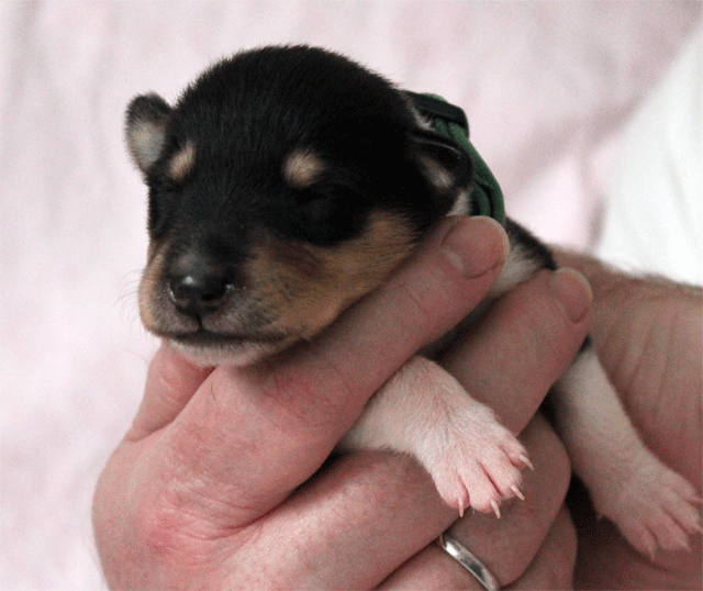 Welpe 4 Hündin tricolour geboren 15.45 Uhr, Halsband grün