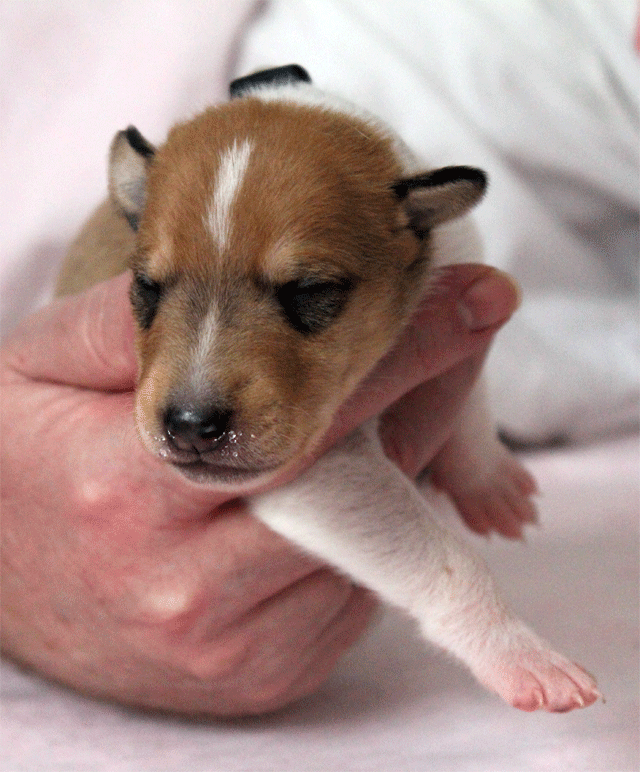 Welpe 1 Hündin tricolour geboren 14.42 Uhr 235 gr.