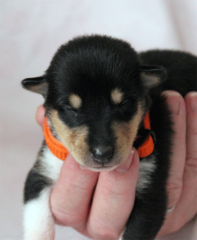 Welpe 1 Hündin tricolour geboren 14.42 Uhr Halsband orange