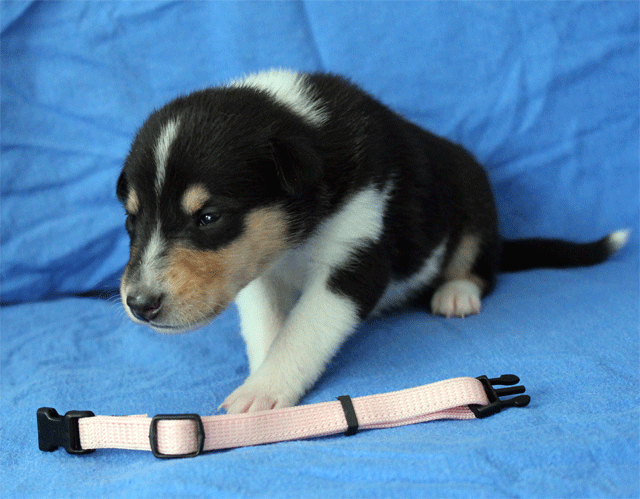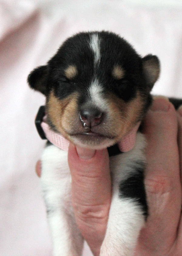 Welpe 3 Hündin tricolour geboren 15.15 Uhr, Halsband rosa
