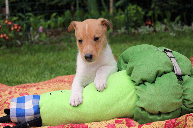 Alle Welpen haben mittlerweile die Augen offen. So kommt das erste Spielzeug in die Wurfkiste und es werden fleißig Laufübungen gemacht. Mama Merida versorgt alle acht Welpen mit großer Freude.