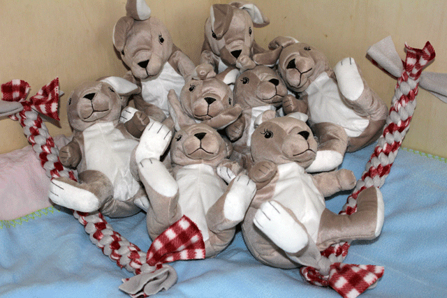 Als Abschiedsgeschenk gab es einen Hasen und ein selber gebasteltes Spielzeug ein: "scoubidou tug" ein Zerrspielzeug aus Fleece