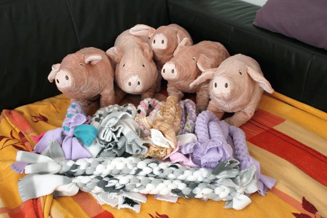 Als Abschiedsgeschenk gab es Scheinchen als Stofftiere und selber gebasteltes Spielzeug ein: "scoubidou tug" ein Zerrspielzeug aus Fleece