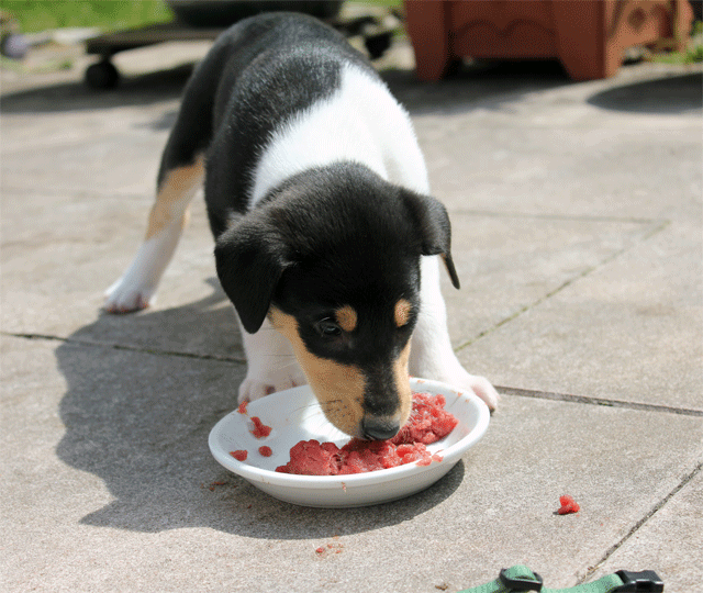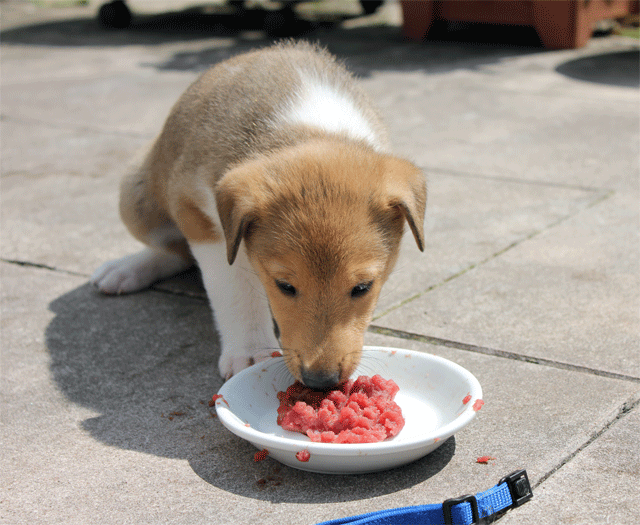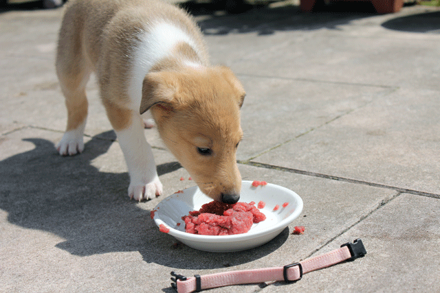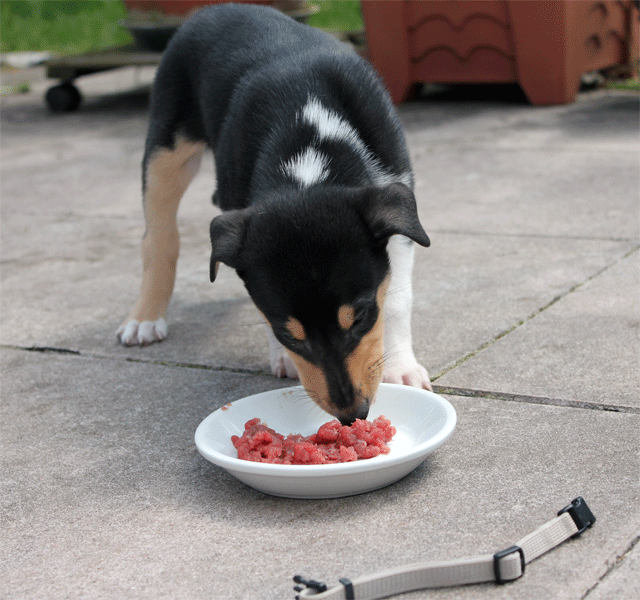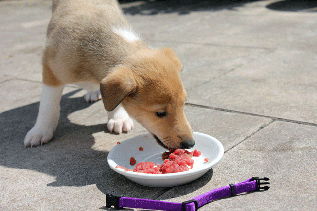 Wie die Zeit doch vergeht. Hier sind die Welpen schon 5 Wochen alt bei ihrer ersten Fleischmahlzeit.