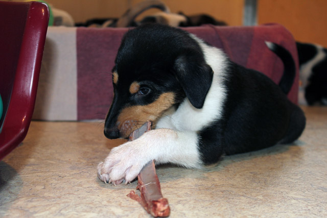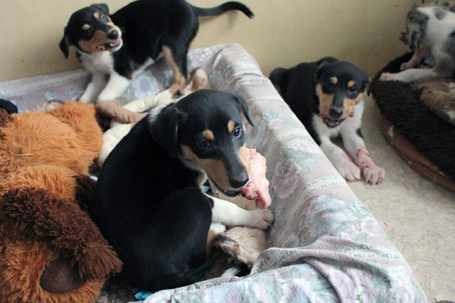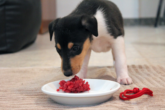 Die Welpen sind nun 5 Wochen alt und da gibt es bei uns die erste Fleischmahlzeit.