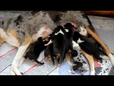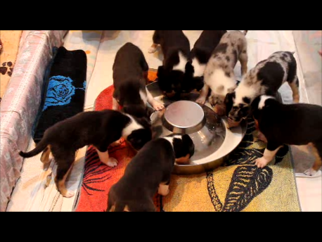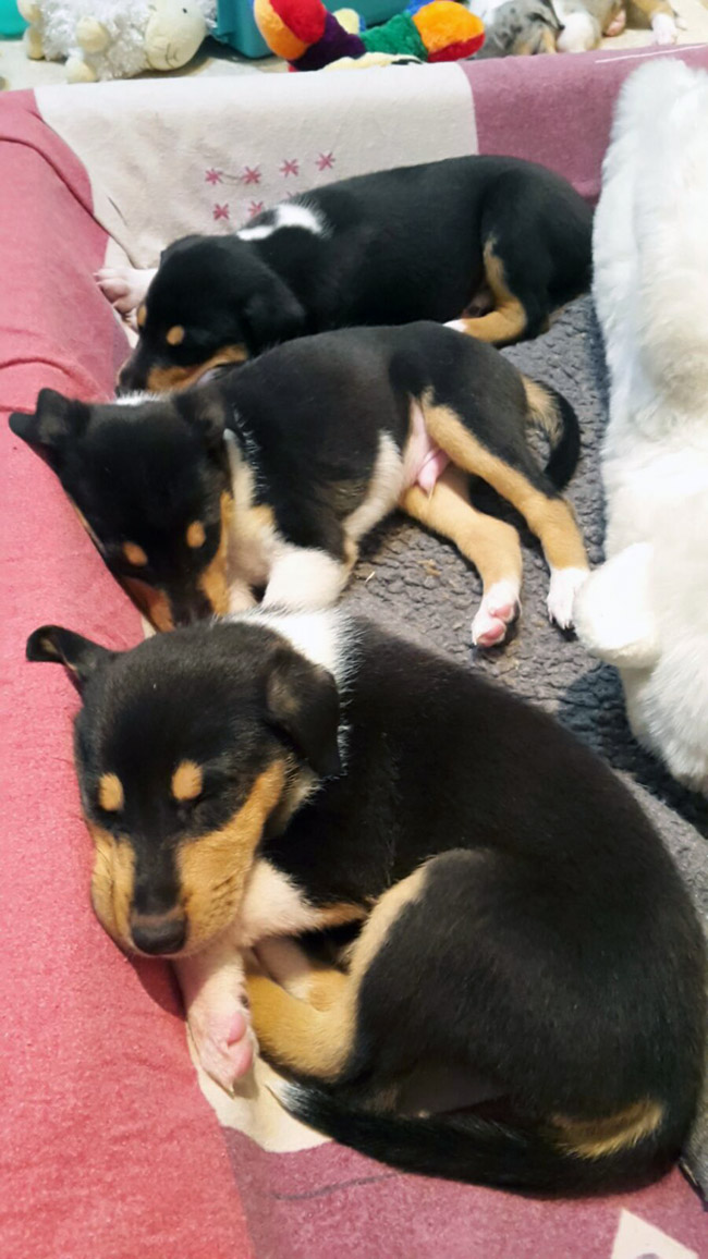 Die Welpen sind nun 4 Wochen alt und haben ihre erste Milchmahlzeit (Ziegenmilch) bekommen.