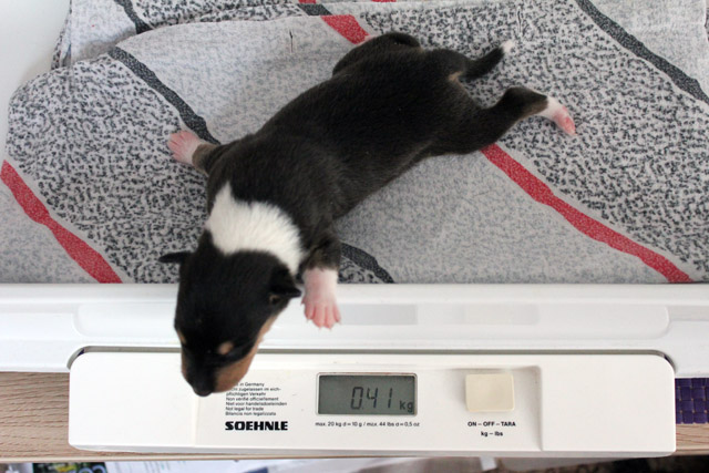 * bedeutet: die Welpen haben ihre Augen bereits leicht geöffnet. Ab der dritten/vierten Woche wiegen wir nicht mehr täglich