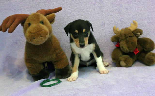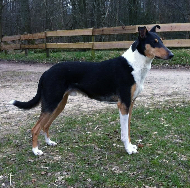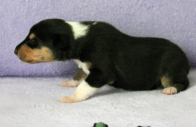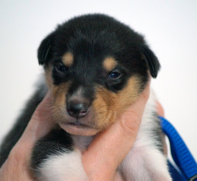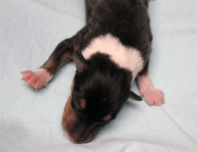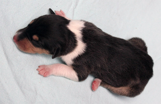 Durchgehende Halskrause, rechtes Vorderbein tricolour. Ganz der Papa