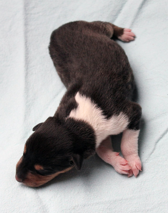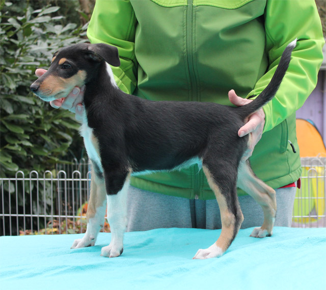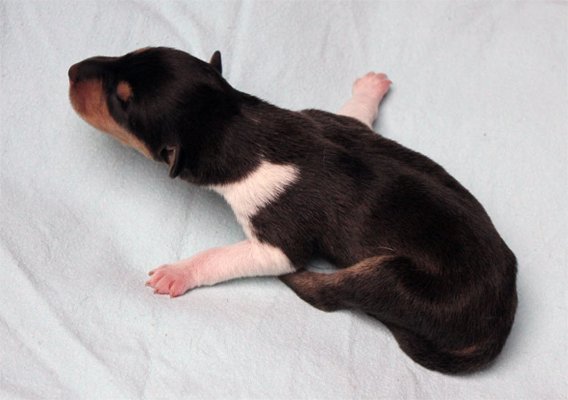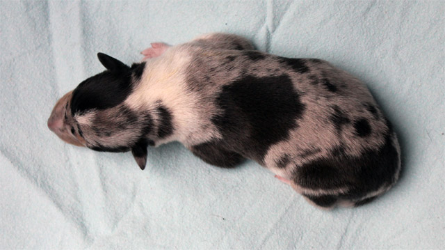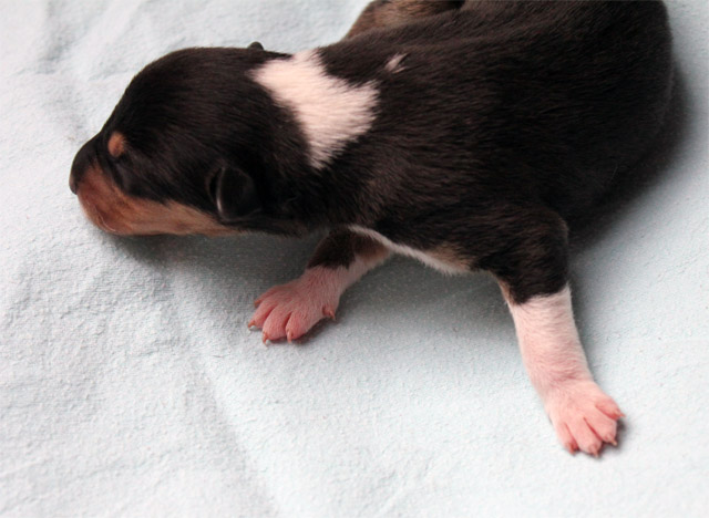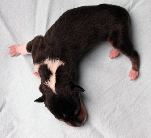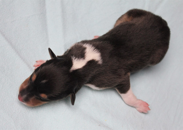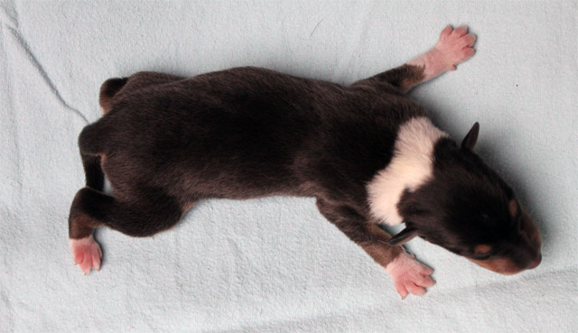 Er hat eine Zeichnung wie eine Fledermaus, tricolour rechter Vorderfuß. Ganz der Papa.