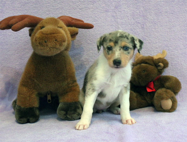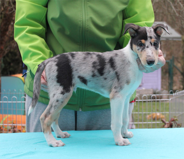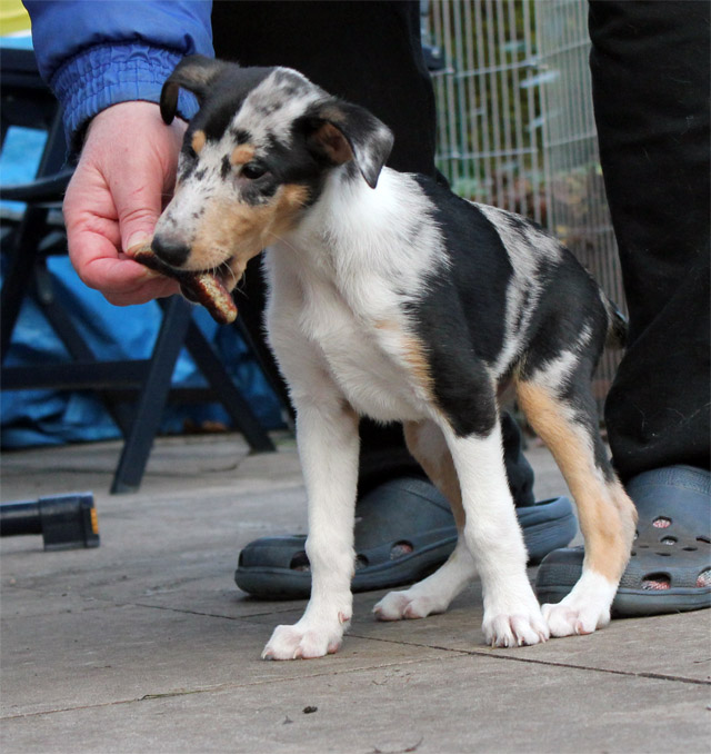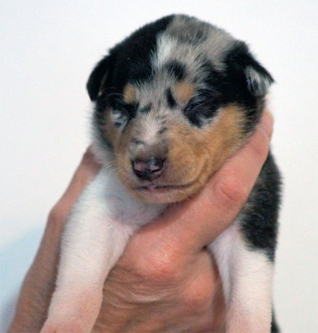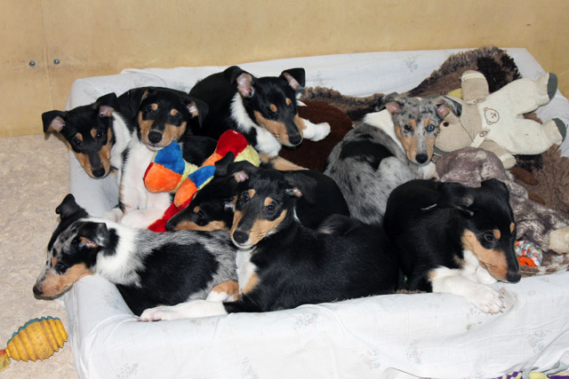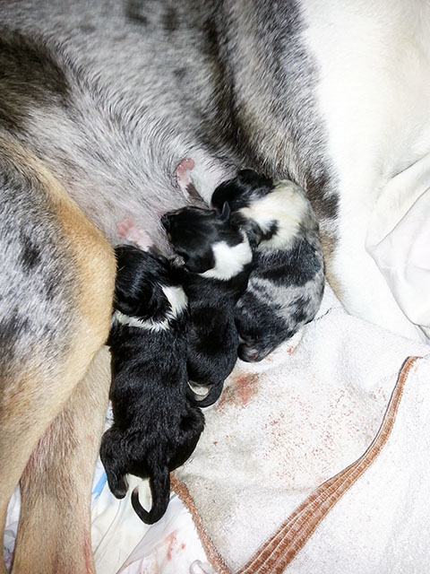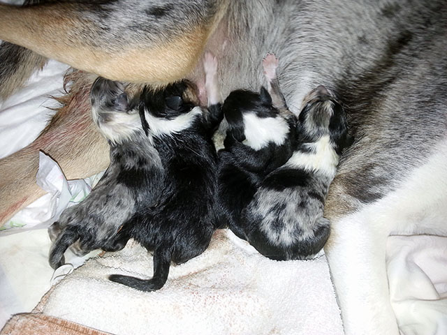 Endlich am 64. Tag fing sie an zu "hecheln" und wollte ständig nach draußen sich lösen. Ein sicheres Zeichen das es bald los geht. Um 17 Uhr hatte Irina dann ihre erste Presswehe. Nach einigen kräftigen Wehen kam um 17.34 Uhr unsere erste Hündin zur Welt. Der letzte Welpe ein kräftiger Rüde kam um 21.26 Uhr auf die Welt. 8 wunderschöne Welpen. 1 Rüde blue-merle, 3 Rüden tricolour, 1 Hündin blue-merle und 3 Hündinnen tricolour. Die Welpen wiegen zwischen 252 Gramm bis 338 Gramm.