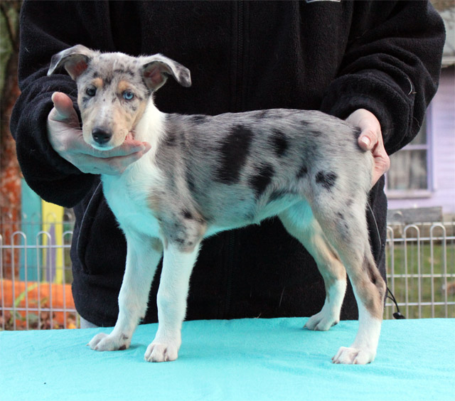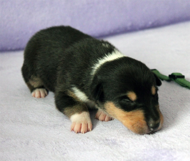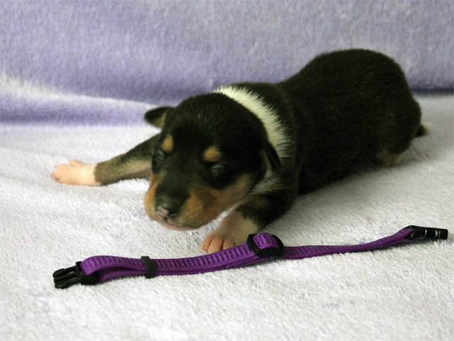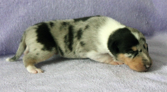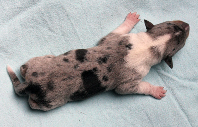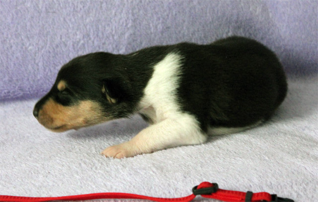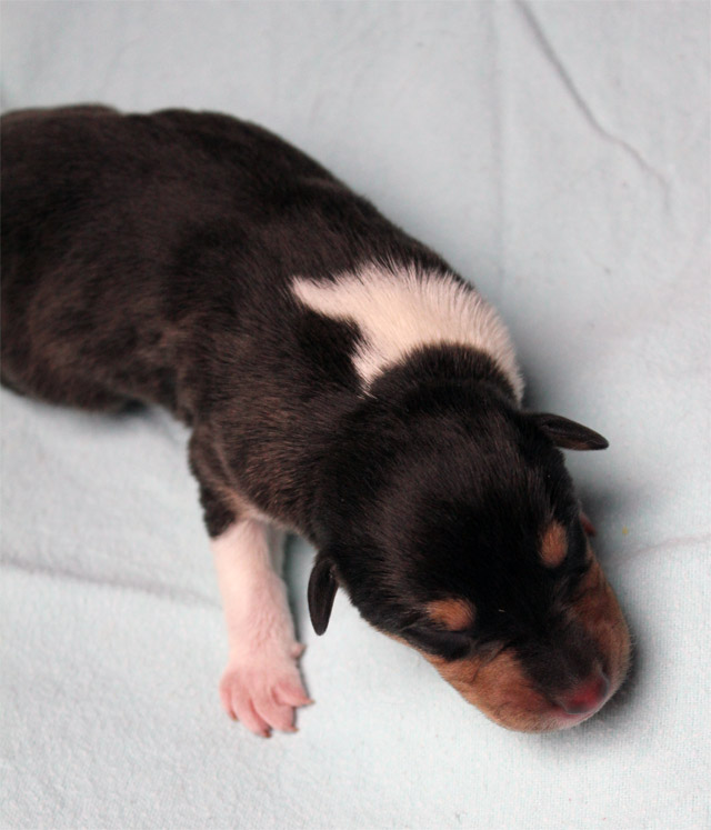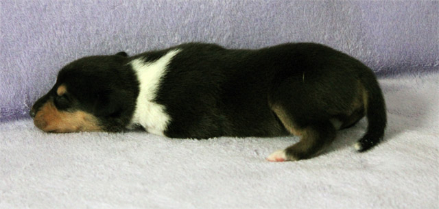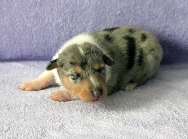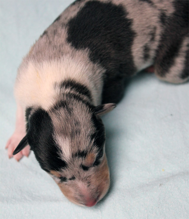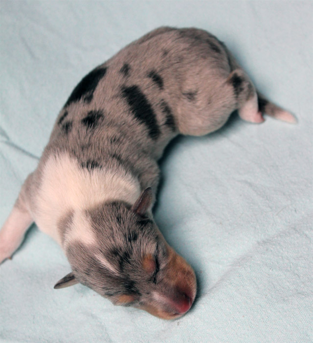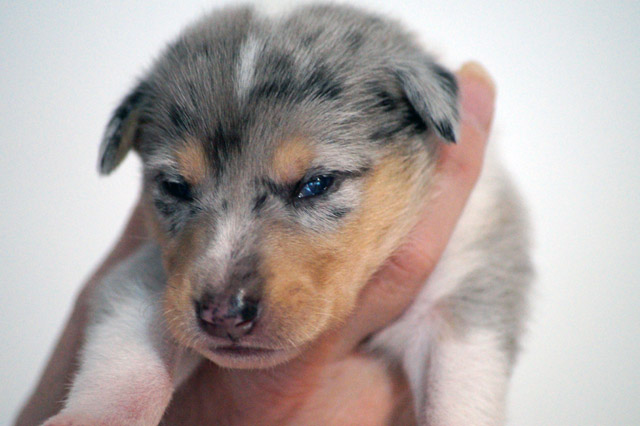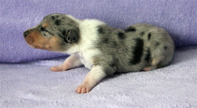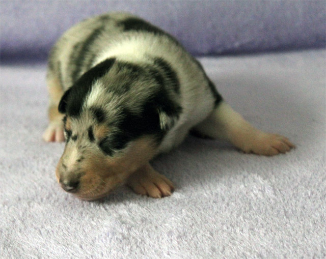 Mittlerweile sind schon 10 Tage vergangen und wir haben neue Bilder von den Welpen gemacht. Alle Welpen haben sehr schön an Gewicht zugenommen. Lieblingsbeschäftigung trinken und schlafen. Sie müssen ja "Groß" werden. Mama Irina ist eine instinktsicher Hündin und kümmert sich super um ihre Welpen. so langsam kommt "Leben" in der Wurfbox auf. Die ersten kräftigen versuche zu krabbeln finden statt und ich meine das sich die Augen langsam öffnen. So ein klitzekleiner Schlitz. Aber das dauert bestimmt nicht mehr lange. Die Beiden blue-merle Welpen haben keine Halsbänderfarben zugeordnet bekommen. Die Beiden kann man sehr gut auseinander halten.