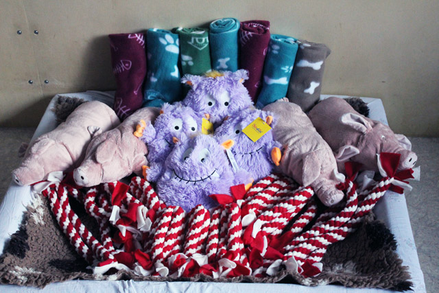 Das bekommen die Welpen von uns mit: ein kleine Vliesdecken, die Jungs Schweinchen und die Mädels flauschige Kuschelmonster