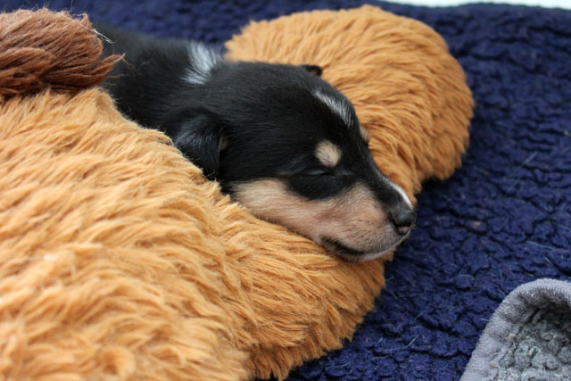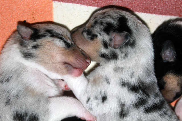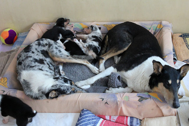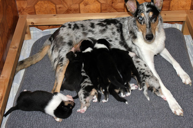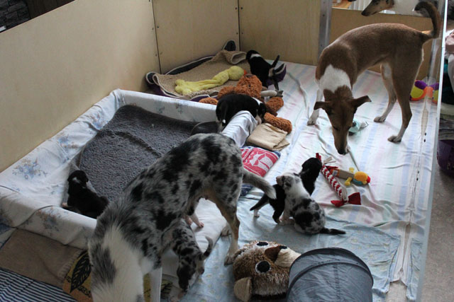 Die Augen sind geöffnet und die Welpen werden nun lebendiger. Brenda darf mit in die Wurfbox und mal nach dem rechten schauen.