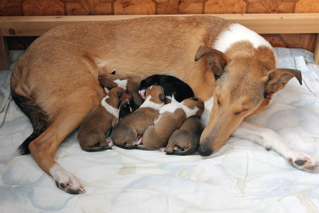 Gestern Abend ist die Temperatur auf 37 Grad gesunken. Ein doch sicheres Zeichen das die Geburt bevorsteht. Morgens begann Merida immer wieder mal zu hecheln. So sind wir in unser Schlafzimmer gezogen, wo Merida am Nachmittag in ihrem Hundebett ihre 8 süße Welpen bekommen hat. Unsere werdenden Mamas dürfe da ihre Welpen bekommen wo sich am liebsten aufhalten. Merida hat die Geburt so super gemeistert und hat auch gleich Ihre Welpen geputzt und umsorgt.
