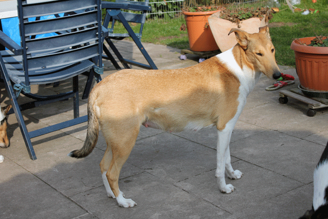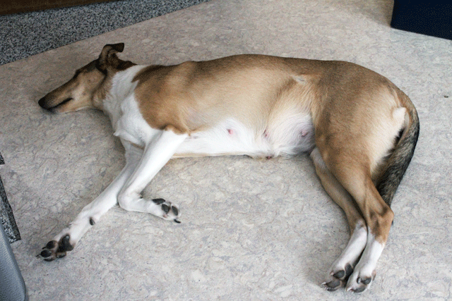 Sie kommt sofort wenn ich mich auf das Sofa setzte zum kuscheln. Dabei streichle ich über das Bäuchlein und versuche schon die ersten Bewegungen der Welpen zu spüren. Ein kleines Füßchen habe ich schon gespürt. Ihr Appetit ist recht groß, kein wunder den die Kleinen wollen ja versorgt werden.