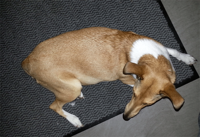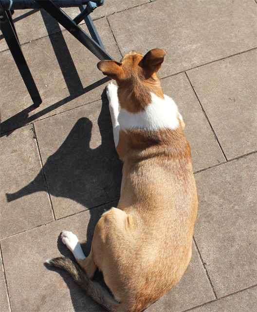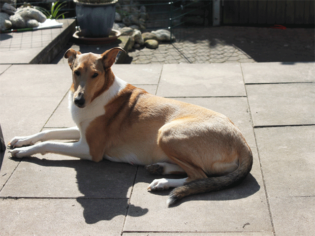 Die Sonne scheint und Merida geniest es auf der Terrasse zu liegen.