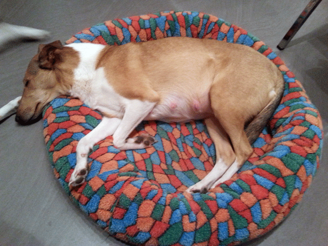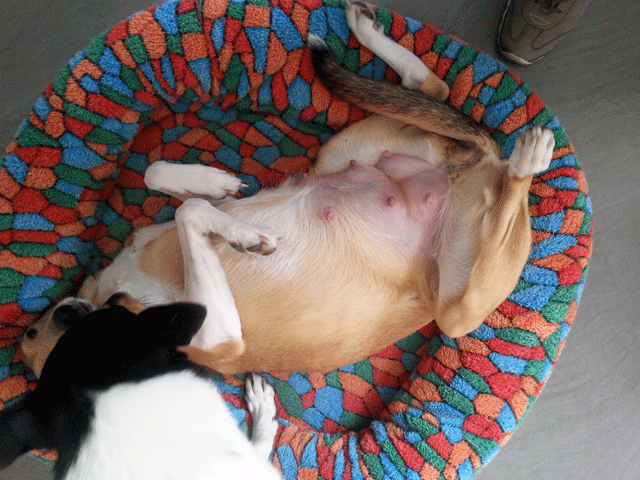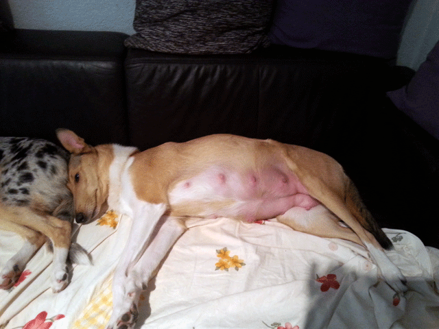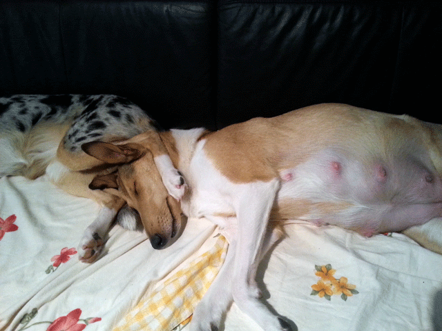 Sofakuscheln mit unseren Hunden. Merida Bäuchlein ist sichtlich runder geworden. Ihr Bäuchlein ist prall gefüllt. Wie viele es wohl werden? Bald ist es soweit und Merida´s Welpen kommen auf die Welt.