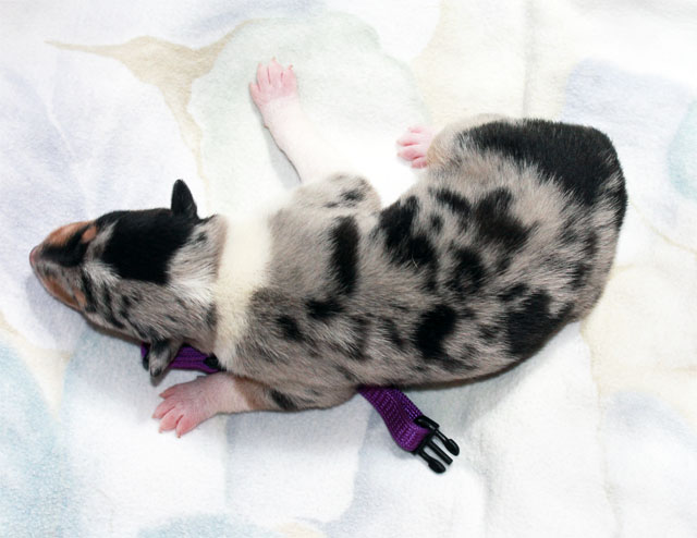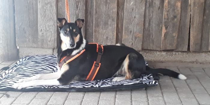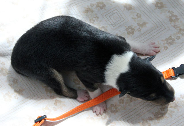 Damit die Welpen mit ihren neuen Besitzern gleich Gassi gehen können, ein Geschirr mit Leine