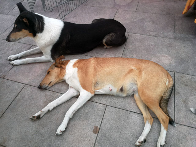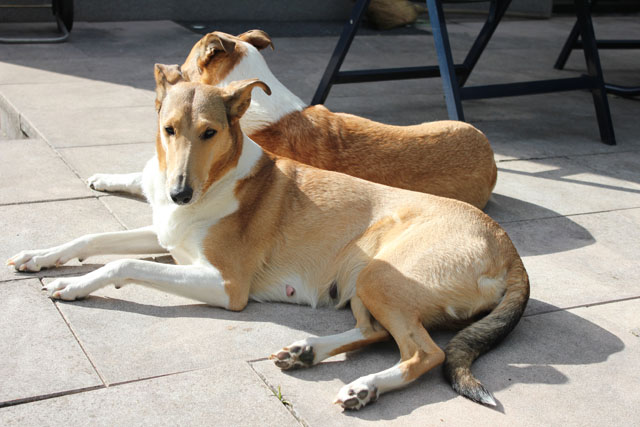 Zusammen mit Ihrer Mutter Kelsey liegt Merida im Schatten auf unserer Terrasse.