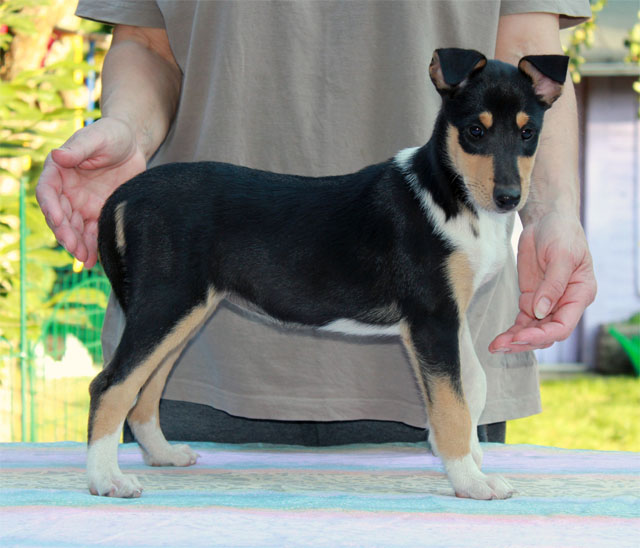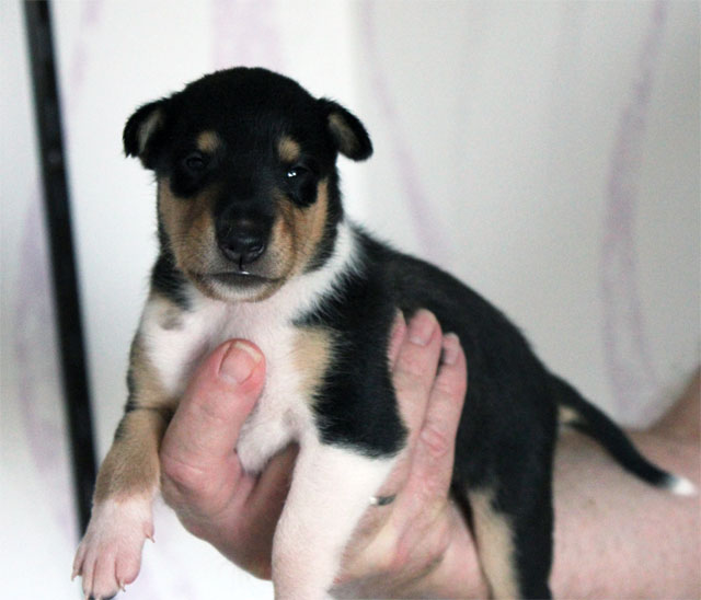 Um 4.55 Uhr war es dann soweit. Eine tricolour Hündin erblickte das Licht der Welt. Dann kam lange nichts. Normalerweise sind wir von unseren Hündinnen verwöhnt das ca. alle 10-20 Minuten ein Welpe geboren wird, dieses mal eben nicht. 1 1/2 Stunden später kam dann endlich der zweite Welpe (6.53 Uhr) eine endlose lange Zeit. Tja, Merida hatte es dieses Mal nicht eilig und so warteten wir wieder eine Stunde bis Welpe 3 kam. So ging es auch mit Welpe Nr. 4 der nach ca. 1 Stunde geboren wurde. Aber dann ging es voran. Um 9.45 Uhr wurde Welpe Nr. 8 geboren.